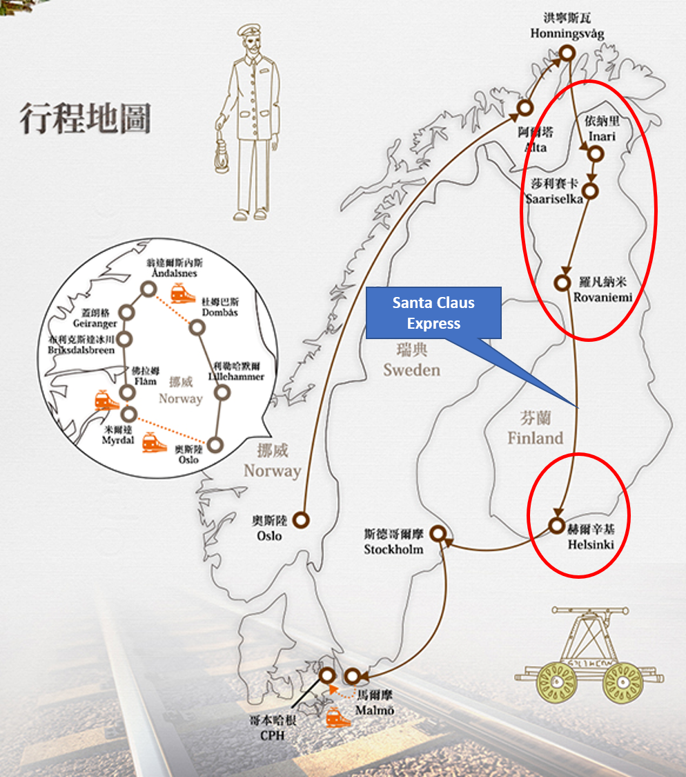 | D07-01-00a_The map of our tours in Finland in which the first route was from Honningsvag in Norway to Inari in Finland | D07-01-00b_National flag of Finland |