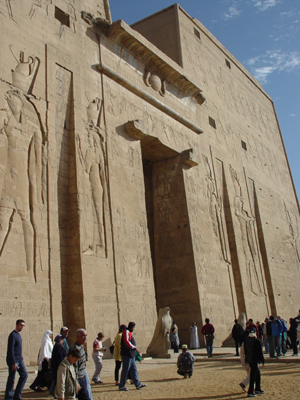 Egypt 2004---D07-03-06 The door with two statues of Horus right at the entrance (only one being complete)