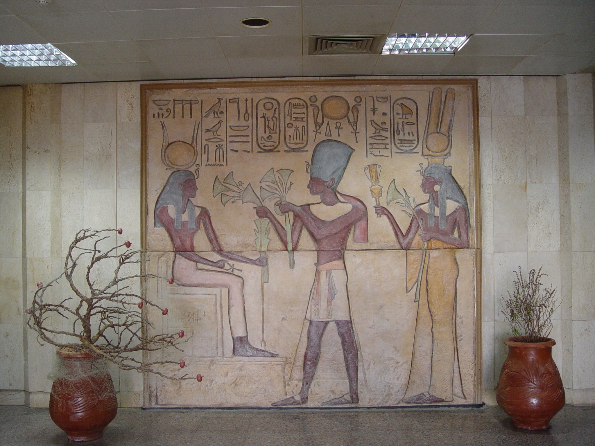 Egypt 2004---D08-01-03 A simulated version of an ancient wall carving in Aswan Airport (Ramses II and Nefertari worshipping Isis)